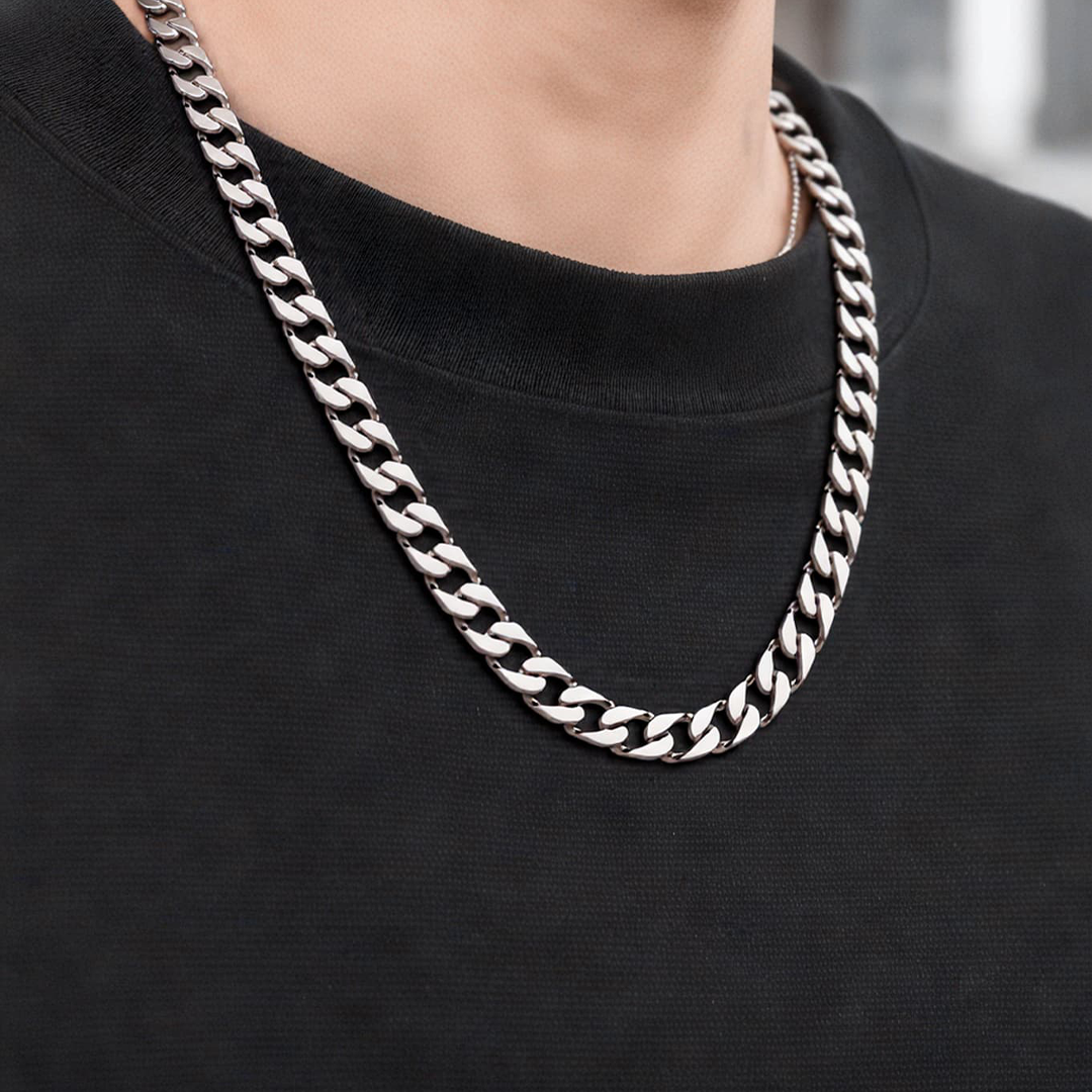 Sleek and enduring, this platinum-toned chain features bold Cuban links with a flawless polish. A timeless essential that defines understated luxury.